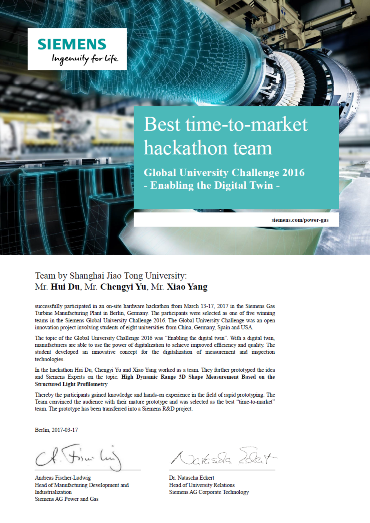 3月12日至17日,西门子全球大学挑战赛“Enabling the Digital Twin”的决赛在柏林西门子燃气轮机总部举行。由买球官网博士生杜辉、余成义、杨肖组成的参赛队伍,在陈晓波老师的指导下,以“燃气轮机关键部件高反光金属表面三维测量技术与原型开发”的课题在全球5支决赛队伍中脱颖而出,获得了该项赛事的“最具商业价值奖”。
