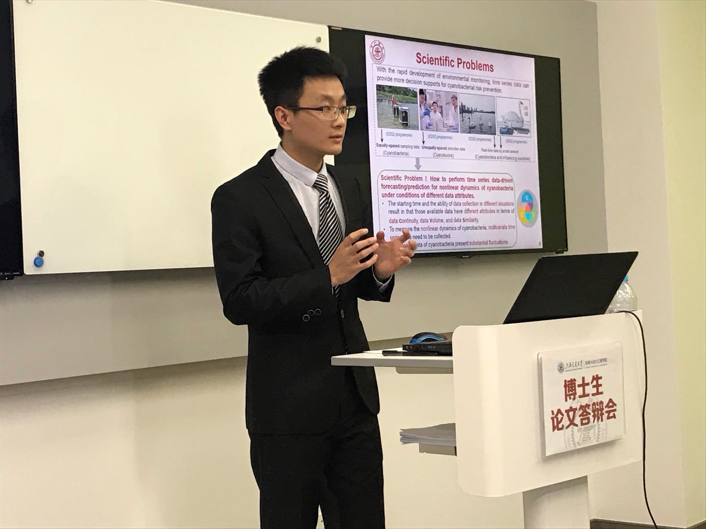 答辩会上,蒋鹏以全英文对自己的博士学位论文“Time Series Data-Driven Machine Learning Models for Preventing Cyanobacterial Risks”进行了详细介绍。该论文的研究问题主要来源于买球官方网站和新加坡国立大学之间的国际合作项目“National Research Foundation Singapore under its Campus for Research Excellence and Technological Enterprise (CREATE): Energy and Environmental Sustainability Solutions (E2S2) for Megacities”。该论文针对如何有效预防蓝藻爆发风险的问题,创新性地将几种机器学习技术整合到时间序列数据驱动的预测方法中,借以建立了一个有关时间序列数据驱动的风险预防支持系统的新研究主题。时间序列数据驱动的超参数优化算法被设计来高效地校准机器学习模型的超参数。该论文不仅提出了一个系统的解决方案来准确地预警蓝藻风险,还提出了一个新颖的网络模型来深度地理解蓝藻爆发和高维影响变量之间的复杂关系,并在此基础上设计了系统且高效的风险预控方案来降低蓝藻风险事件发生的可能性。案例分析表明该论文所提出的蓝藻风险预防的系统解决方案能为管理者提供有效的决策支持。