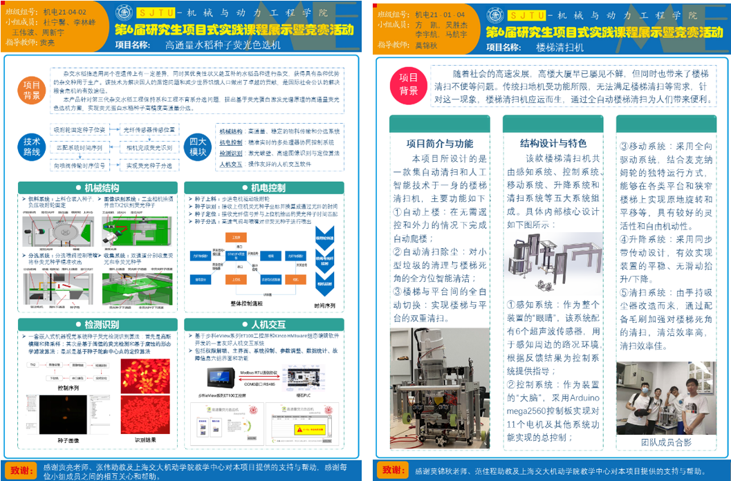 本次研究生项目式实践课程展示竞赛共有46个项目参展,按照“工业应用”、“智能产品”、“智慧生活”、“品质生活”四个主题分类。校内外专家和研究生新生从创作灵感、技术细节、应用场景、未来改进等多个方面与参展同学进行了充分的交流。经过校内外专家评审以及新生票选,最终“高通量水稻种子荧光色选机”、“轻量化咽拭子自动采集系统”、“楼梯清扫机”、“皮影戏表演机器人”分获四个主题的一等奖,“皮影戏表演机器人”荣获最佳创意奖,“墙面空鼓检测爬壁机器人”荣获最佳技术奖,“智能车间清扫机器人”荣获最具商业价值奖,“共享平衡车”、“烹饪机器人系统”、“吞云吐雾-基于喷雾相变制冷的室外降温解决方案”、“基于大数据的室内空气质量及人体舒适度自适应调节系统设计”4个项目荣获最受欢迎奖。