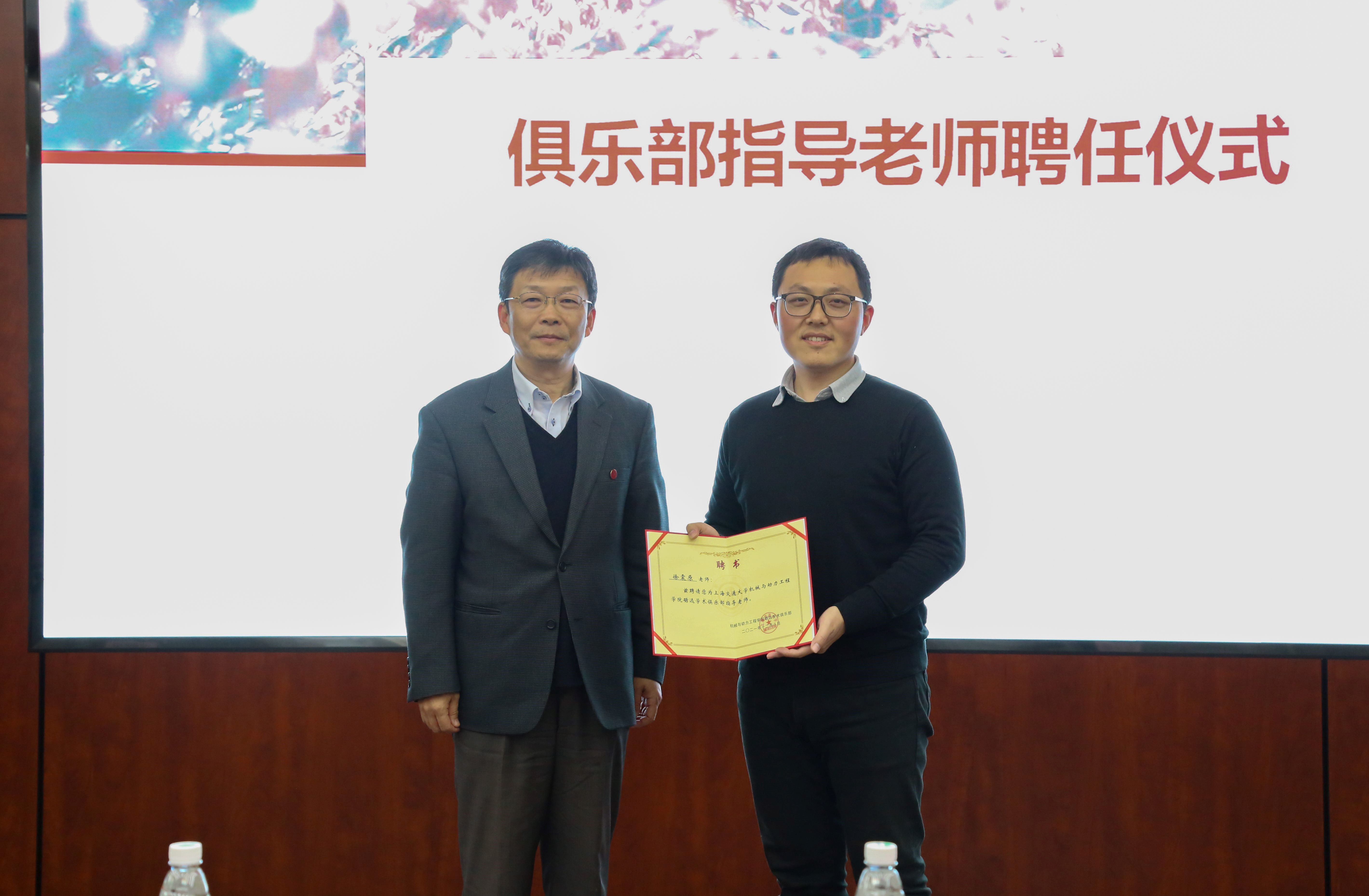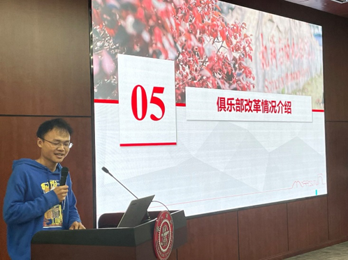 俱乐部副主席李天奇总结了2020-2021学年工作情况,俱乐部先后举办了学术沙龙、学术年会等活动,俱乐部成员斩获60余人次荣誉奖项,发表论文73篇,申请专利及软件著作权16项。俱乐部主席冯苗对俱乐部名称变更研讨过程、俱乐部章程、改革目标和改革举措等进行了详细介绍,指出后续将带领俱乐部成员以俱乐部章程为指导,将俱乐部打造成为博士生高水平培养、交流和展示的平台。副主席严嘉玮介绍了本届俱乐部的管理委员会、部门组成,以及2021-2022学年工作计划。在场师生还投票选出俱乐部的部旗和部徽,指导教师蔡伟伟为俱乐部授予部旗。