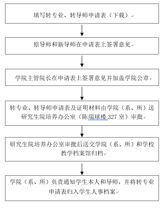 校内转专业的,由本人提出申请,经原导师和学院同意,同时征得拟转入导师和学院同意后,报研究生院批准。