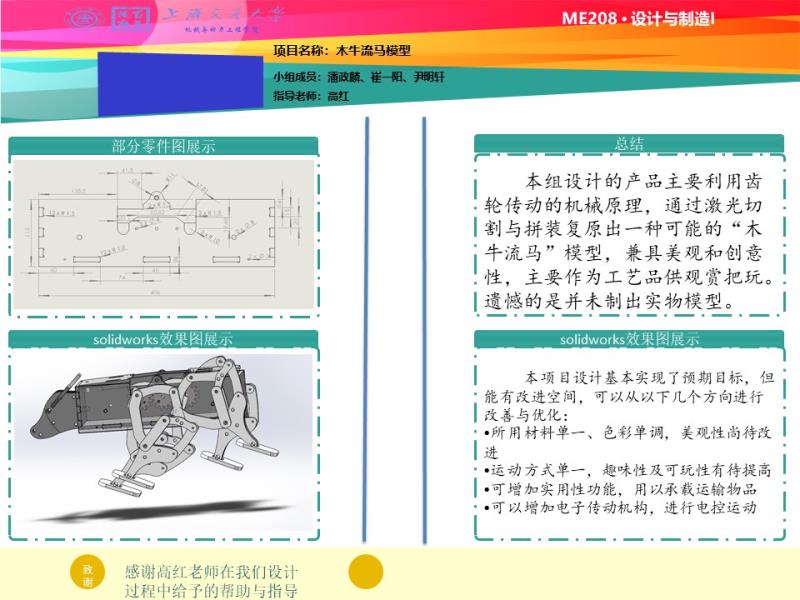 经过草图绘制和实际建模,我们成功在SolidWorks里面搭建了木牛流马的模型。再进行配合之后,在SolidWorks里面实现了传动的原理。牛身里面有三个齿轮。而两个外侧的齿轮连接着两个传动轴。传动轴连接着木牛流马的四个脚。当木牛流马被拉着走时,与脚连接的轴就会带动齿轮转动。通过齿轮的配合,最后再带动整个木牛流马移动。详情可以参考我们的视频来了解传动原理。