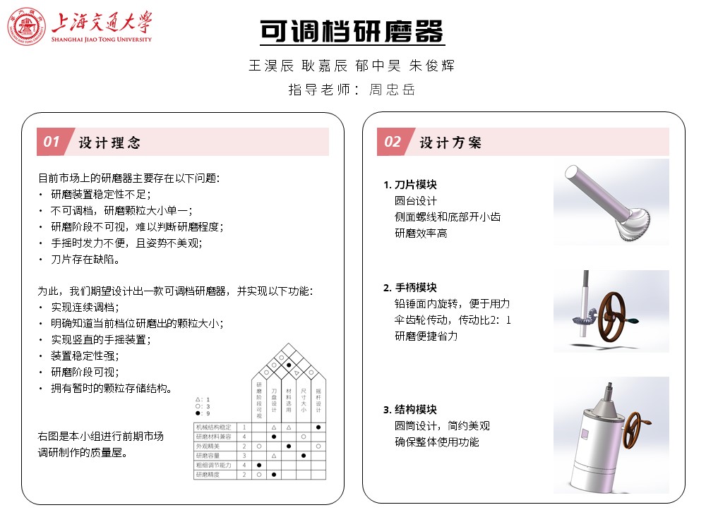 很多人都希望拥有一款解决上述问题的普适性研磨器,完成咖啡豆,胡椒等各类餐饮材料或药用素材的研磨。结合用户调研信息并进行项目质量分解,我组最终决定致力于研究这样一款能够满足当今市场要求的研磨器。