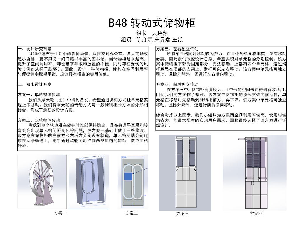 转动式储物柜,顾名思义,通过转动的方式取得位在高处的书籍或物品,兼顾安全便捷又不会过度降低空间利用率,在处处以便捷为追求的社会环境下,不用麻烦他人、不分男女老少,仅凭一己之力就能解决曾经的大麻烦。消費者主要需求:耐用、安全性、使用不费力。符合产品设计理念,又能贴近消费者的需求,是我们最大的目标。