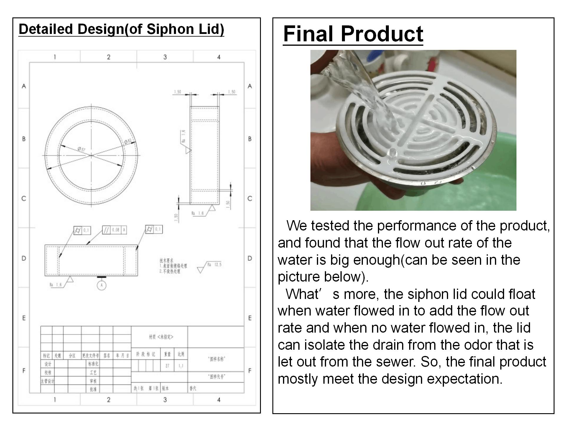 基于上述目标,项目成员设计并制造出了最初版本的产品。实际测试后,发现其排水量不能满足项目目标,原因在于虹吸盖的设计有缺陷而未能提供足够的浮力。讨论后对其进行重新设计,并制造出了最终的产品。最终产品能够同时满足本项目最主要的三个指标。排水时,可以看见虹吸盖有明显的上浮,不用时虹吸盖自然封住管道以保证气密性,符合最初的设计理念。总体上,项目生产出的产品性能表现非常出色。由于当前加工手段的缺乏,最终产品在一些处理上并非最理想的状态,若后续实际投产,仍可做进一步的优化升级。