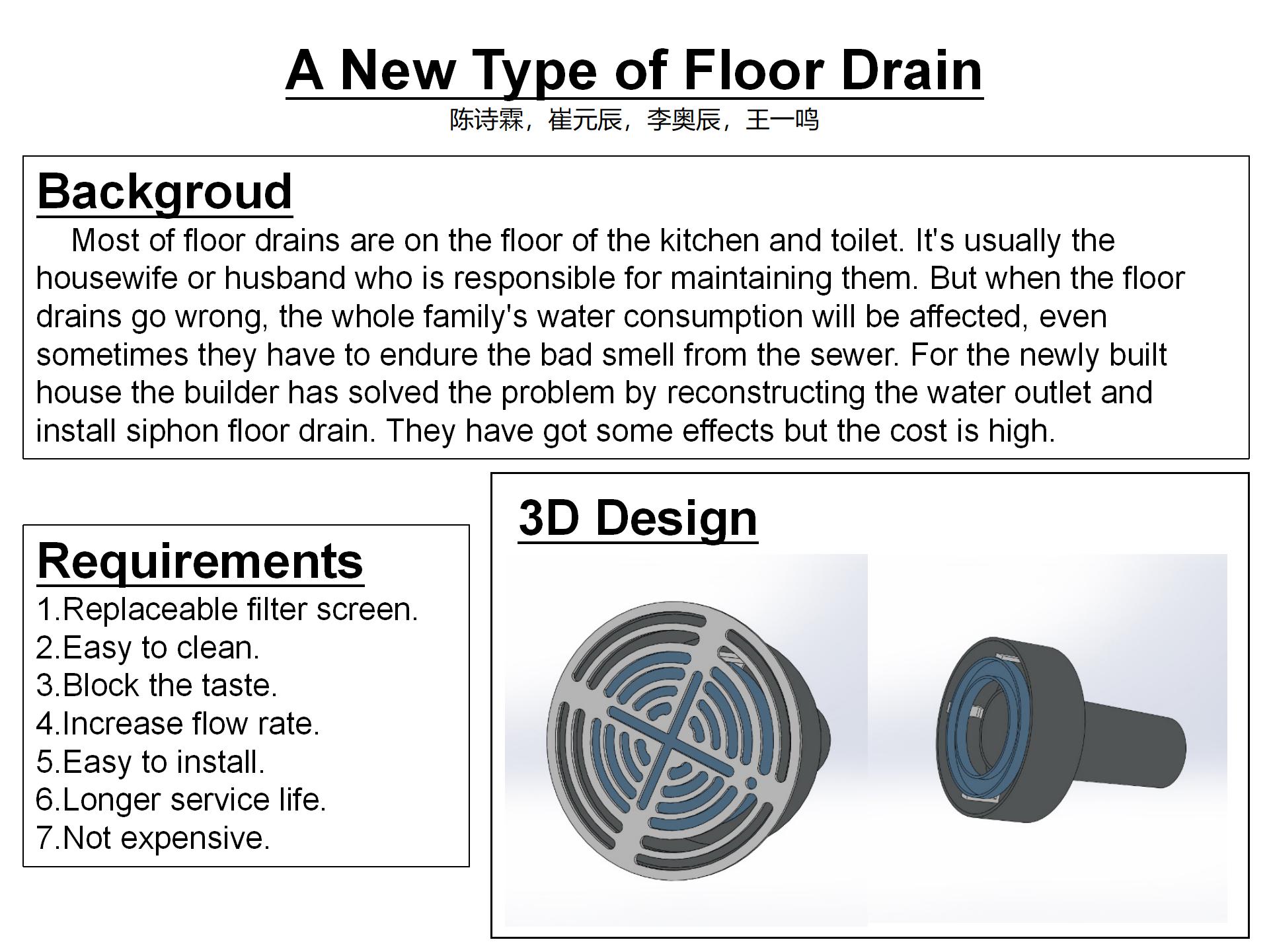 许多老式公房都饱受旧式地漏带来的一系列糟心,而目前市场上现行的地漏产品都往往是气密性、排水量与易拆装性三者不可兼得。本项目成员正是发现了这一实际问题,决定设计制造一款同时可以兼顾以上三方面的新型地漏。产品主要由管道主体、虹吸盖、顶盖三部分组成。其利用液体的浮力,以质地轻盈的材料制造产品,使虹吸盖在排水时内部的虹吸盖能上浮以保证排水量,闲置时利用液封保证气密性,同时使用标准件与合理设计保证了可拆装性。