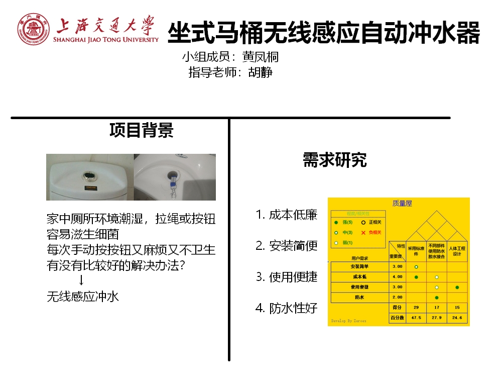 装置成本相对低廉,控制成本是任何一个产品的基础要求。冲水装置安装简便,如果整套装置非常复杂,安装过程费时费力的话,人们便不会去选择使用这套装置。装置使用便捷,和安装简便一样,就算安装很容易的话,如果日常使用起来还是很麻烦的话,使用这套无接触冲水装置的必要性也会降低。整个装置具有良好的防水性,除了应对日常的潮湿环境外,水箱中的电磁阀还要具备水下正常工作的能力。