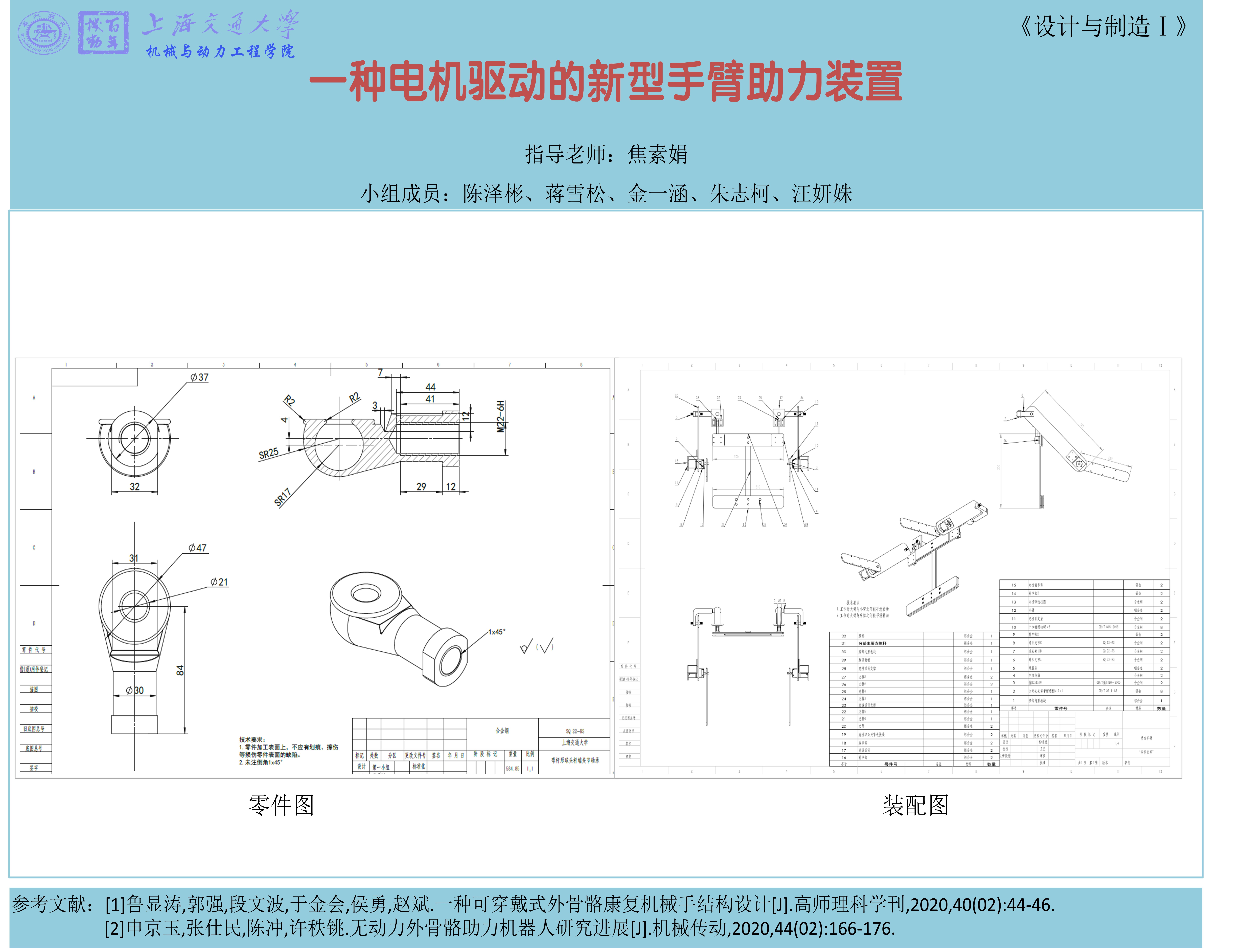 因为本学期情况比较特殊,小组同学只能在网上讨论,无法线下联系,加工实物的进程也难以展开。故最后决定用电脑做简易的一个样机模型,成品如下图所示。(胸带和腰带没有显示出来,分别位于背部的上下两块板处)装置整体结构较为简单,所用的材料也多为铝合金。加工方式以钣金和钻孔为主。把铝合金加工成想要的形状后,在相应部分打上特定尺寸的孔,然后通过螺栓将其一一连接起来。在大臂和小臂连接处有一电机固定支座用于安装电机。总的装配顺序是从背部到两臂。为了增加产品的表现力,小组成员还做了相应的手臂助力装置的爆炸动图。