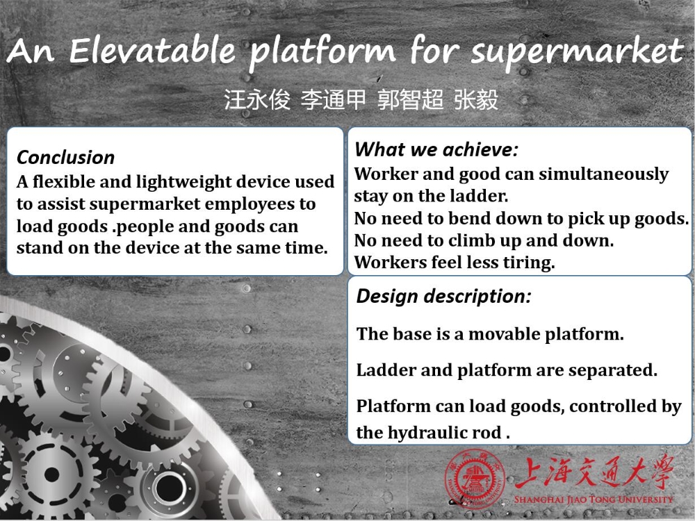 We propose a plan—An Elevatable platform for supermarket. Our project target is to create an equipment which can help the staff put the goods on the shelves. And this equipment will be easy to use, occupy smaller space and the price of it will be low. This platform will be elevatable and it can carry a lot of weight. This equipment will be composed of at least three parts—chassis, elevator, ladder and so on. There are four wheels under the chassis. The wheel under the chassis make sure it can be moved freely. And the elevator will be the most important part which needs to carry the goods. We will use hydraulic rod to control the elevator. In the meanwhile, the elevator goes up and down by the controlling of hydraulic rod. By this, users can arrange the goods at a so suitable height that they won’t be so tired.