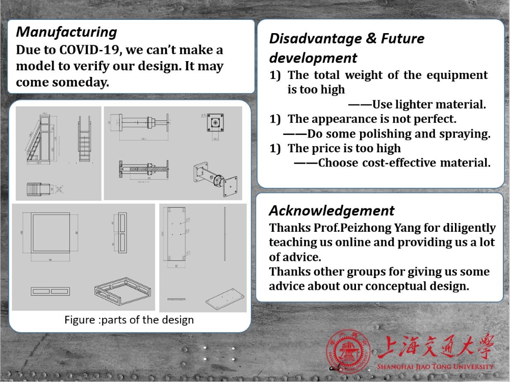 This project is made by the group “I-climbing: Easier to load goods” which is from the class of prof. Yang. Our team has four members——Tongjia Li, Yongjun Wang, Zhichao Guo and Yi Zhang. Our project idea is derived from the supermarket. As we know, the worker in the supermarket usually put the goods on the shelf without any equipment. If the shelf is high, he may not only try to do it on tiptoe, but also need to bend over to pick up the goods over and over again which is so tiring and troublesome. So, how to solve this problem? We plan to make an equipment which can help the staff put the goods on the shelves. We used almost 14 weeks to implement this project. During the process, we first did the market survey and made the questionnaires. And then, according to the results of market survey, we made a QFD of the ladder in the supermarket. By QFD, we did some concept designs and finally chose the best one. After that, we used UG to draw 3D model of the final design. The manufacturing tools we decided to use are cutting machine, welding gun, wrench, screwdriver and grinding apparatus. The cost of the project is around 2500 yuan.