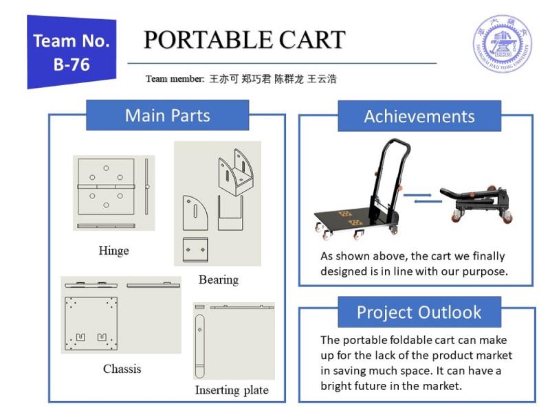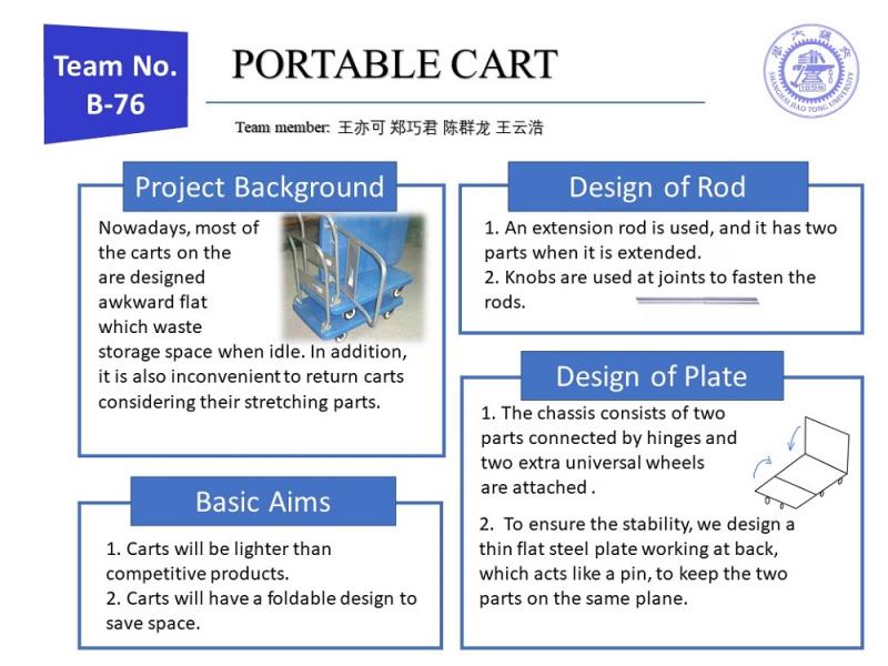 Our project is to design a portable cart suitable for families and individuals to carry heavy objects. According to our market research, we found that most of the carts on the market can be divided into two categories. One is that it can carry heavy goods, but it is not easy to carry and takes up a lot of space when idle; the other is that it can be folded and carried but can not carry heavy goods, such as luggage. So we hope to design a cart that can not only meet the needs of the family, but also be easy to fold.