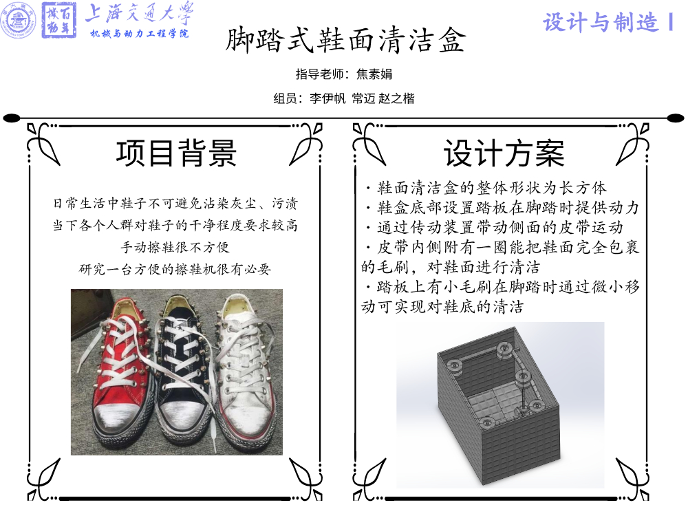 在日常生活中鞋子与地面接触,不可避免地出现沾染灰尘、污渍的情况。当下无论是年轻人还是中年的上班族,对鞋子的干净程度要求都比较高。 但是每次出门或者是回家手动擦鞋很不方便,因此我们设计研发了脚踏式鞋面清洁盒,希望通过脚踏的方式对鞋面进行清洁。一方面脚踏式的鞋面清洁盒构造相对简单,制造成本较低;另一方面通过脚踏就能对鞋面进行清洁,在方便的同时又有一定的趣味性。