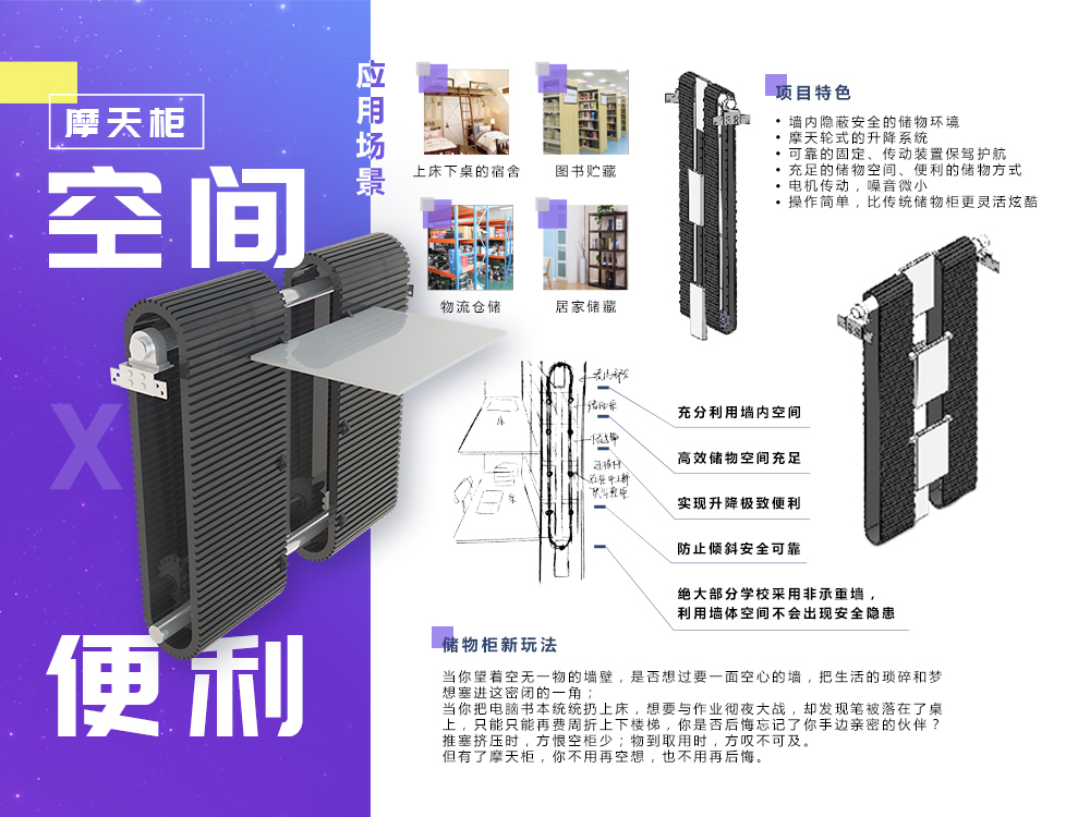 项目希望通过以“摩天柜”的形式,利用墙体内部空间,从而实现宿舍储物空间的扩增,增加寝室可储物面积,提高寝室的空间利用率,方便大学生生活;同时其移动功能可以帮助大学生在上床下桌的取放物,并且由于内置柜的特性增强了大学生的储物隐秘性,保护大学生的隐私和财产安全。同时从长远看,摩天柜的大力推行还可以节省高校土地资源,带来巨大的经济效应。