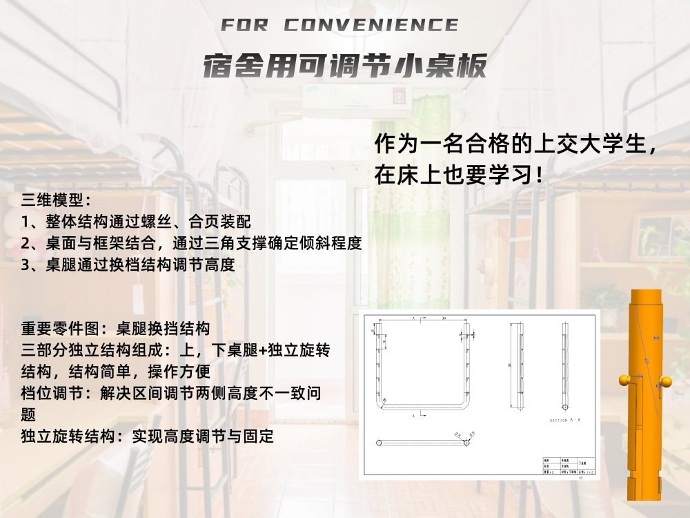大学生有时会遇到感冒,发烧等身体不舒服,以及参与体育运动过程中腿部受伤等情况,导致短期的行动不便。而当前市面上额小桌板存在牢固和灵活方面的问题,不能满足他们在床上的学习办公需求,针对这种情况,我们为大学生群体设计了一款在床上使用的可调节固定桌面高度与倾角的小桌板,在追求灵活性的同时也不失牢固性,让他们在宿舍床上完成作业,使用电脑可以更加方便舒适.