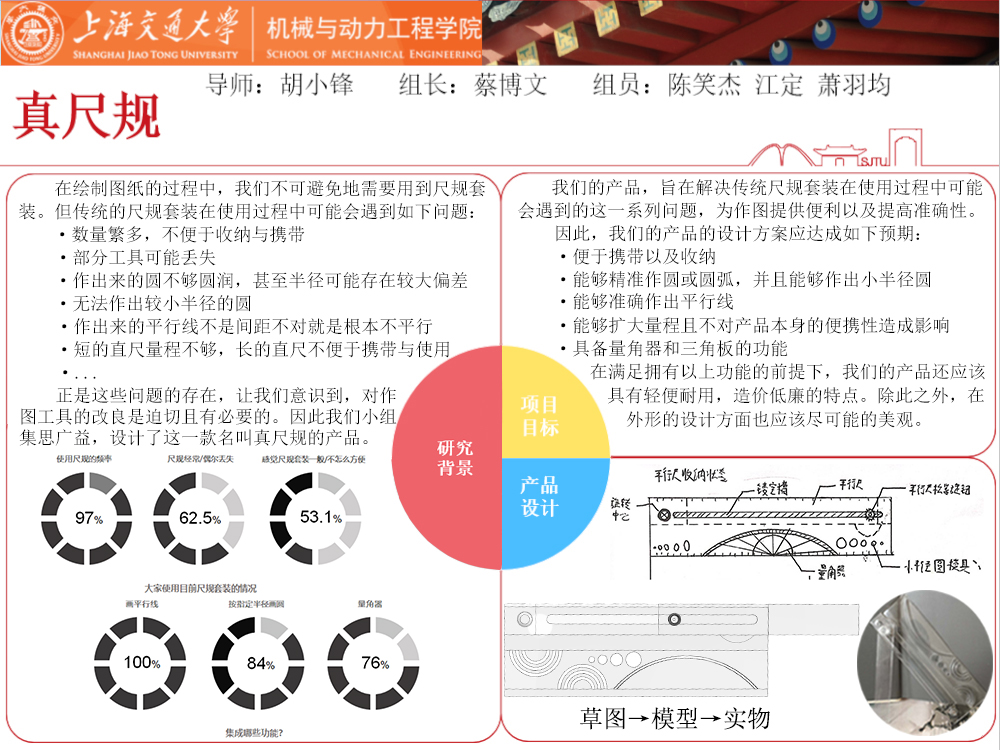 真尺规项目旨在解决绘图工具现存的种种不便之处,减轻绘图者的工作负担。根据市场调研,真尺规项目需着达成的主要目标如下:一是集多种绘图工具为一体,便于携带收纳。二是设计平行线绘制装置,简化绘图操作。三是设计稳定精确的绘圆装置,提高绘图精度。四是设计可扩充量程直尺,提高绘图效率。五是重新设计量角器形状,缩小尺规尺寸。六是采取常用轻质透明材料,降低制作成本。真尺规综合现有绘图工具的不便之处与绘图者的意见建议,制订上述六大目标,致力改善绘图体验。
