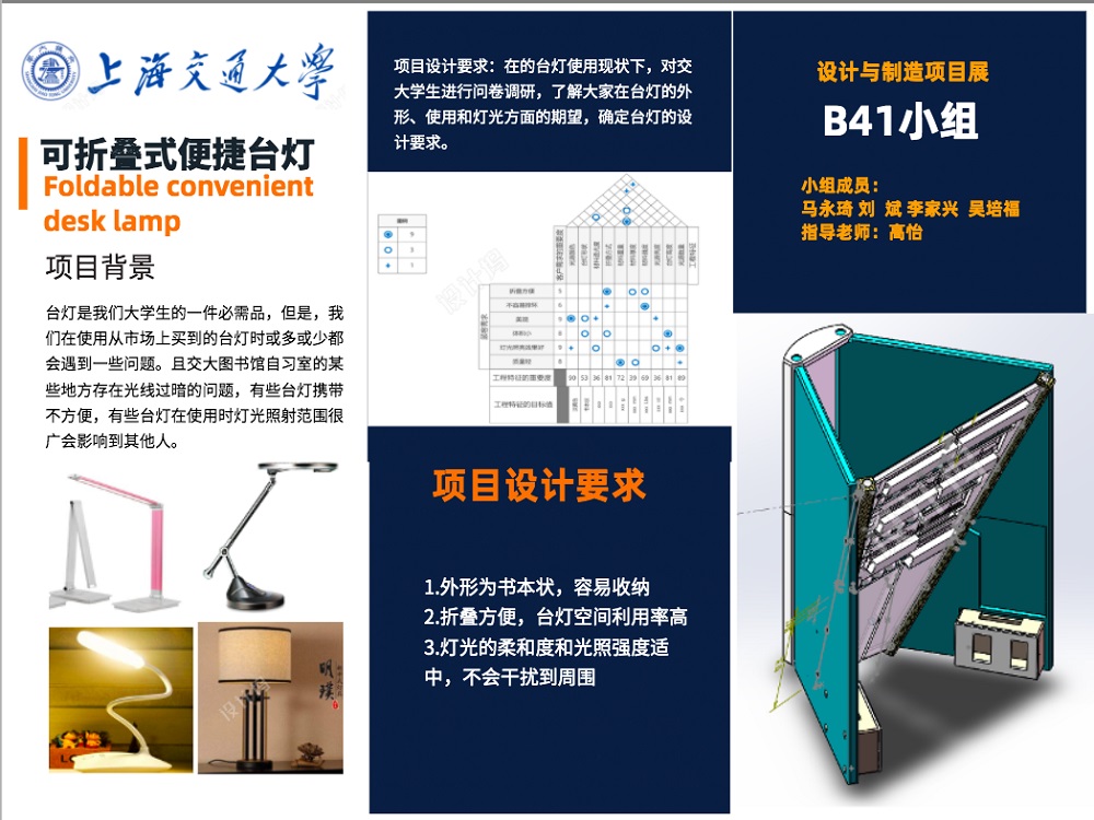 经过一学期的线上讨论和工作,我们完成了:通过问卷调研得到折叠台灯的设计要求,通过作质量屋对产品的工程特性进行分析,确定设计结构;线上讨论多个概念草图,取长补短确定最终设计方案;通过Solidworks对可折叠台灯进行3D建模,设计关键零部件的参数和误差来实现不同零件之间的配合;在照明的同时我们也考虑到增加复合功能的台灯,包括笔筒、充电宝等功能;确定产品加工方案——以民用消费级3D打印作为主要加工手段,小部分零件将通过网上采购完成。