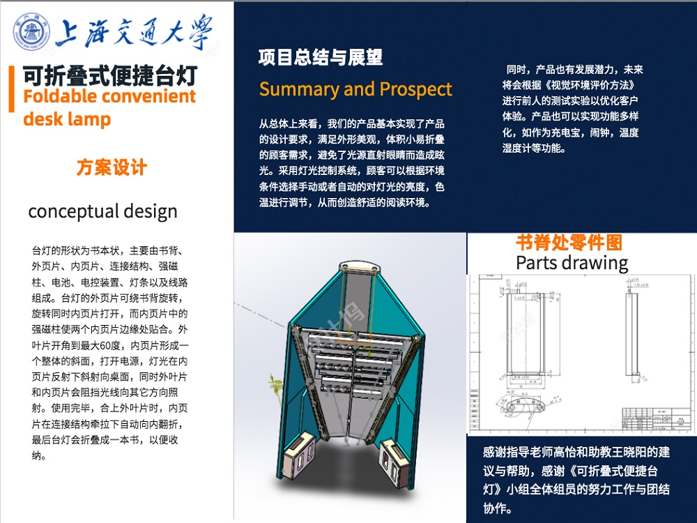 调研学生对可折叠台灯的需求,根据调研结果合理设计台灯折叠前形状,便于在书包中收纳携带也要保证美观性;通过嫁接折纸工程的应用成果,优化改造台灯折叠结构,提高美观性和空间利用率;对灯光照射效果评估,通过市场调研和内测设计合理的灯光照射角度、范围,在保证照明效果的同时减少对周围同学的影响;规划产品加工方案,包括材料、加工工艺等方面,对加工难点进行预测并提出应对方案;估算产品的模型成本价格与成品价格,为台灯能够批量生产做好方案预算。