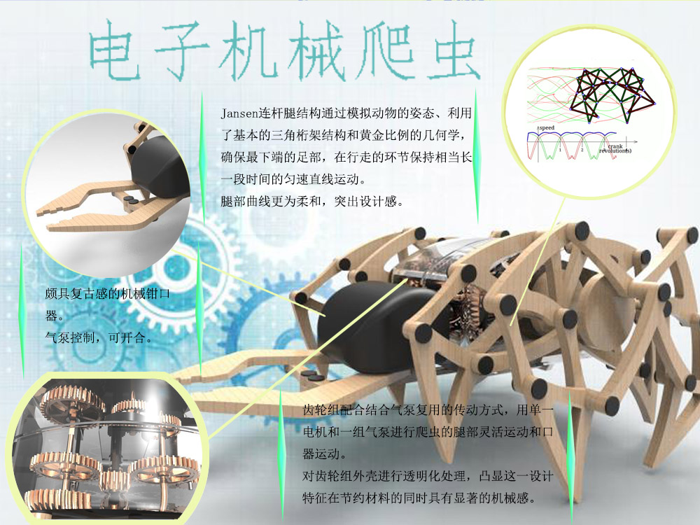 以突出趣味性和可玩性为出发点,我们组旨在开发一款具有显著机械感和设计感的玩具爬虫。该爬虫使用设计感比较强的杨森连杆系统组成腿部构件来替代传统的单一杆传动系统,突出视觉特征。又采用齿轮组配合结合气泵复用的传动方式,用单一电机和一组气泵成功进行爬虫的腿部灵活运动和口器运动。对齿轮组外壳进行透明化处理后,凸显这一设计特征在节约材料的同时具有显著的机械感。配合相应的电子遥控设备,该产品对潜在的客户群体具有较强的吸引力。