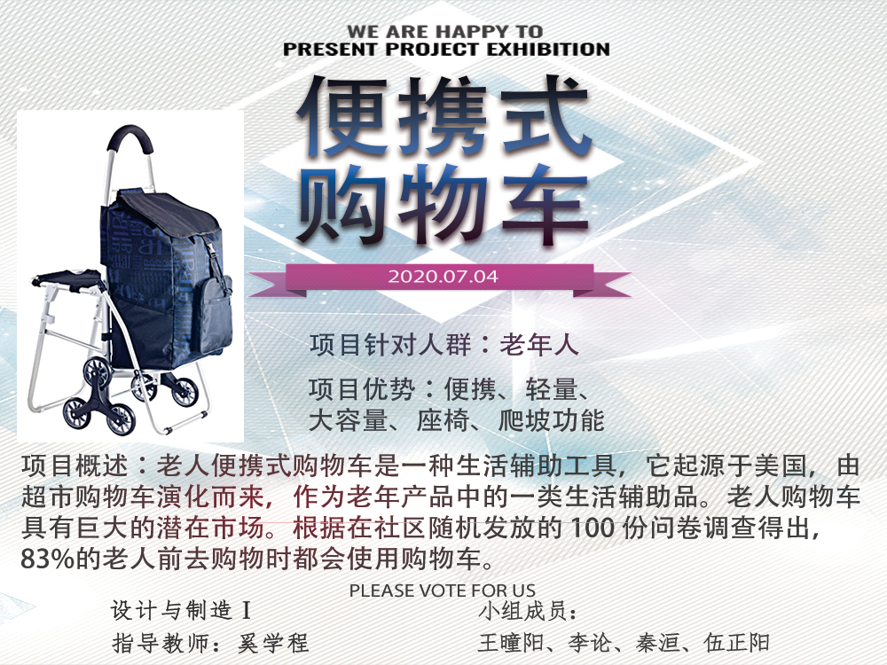 老人便携式购物车是一种生活辅助工具,它起源于美国,由超市购物车演化而来,作为老年产品中的一类生活辅助品。老人购物车具有巨大的潜在市场。根据在社区随机发放的 100 份问卷调查得出,83%的老人前去购物时都会使用购物车。