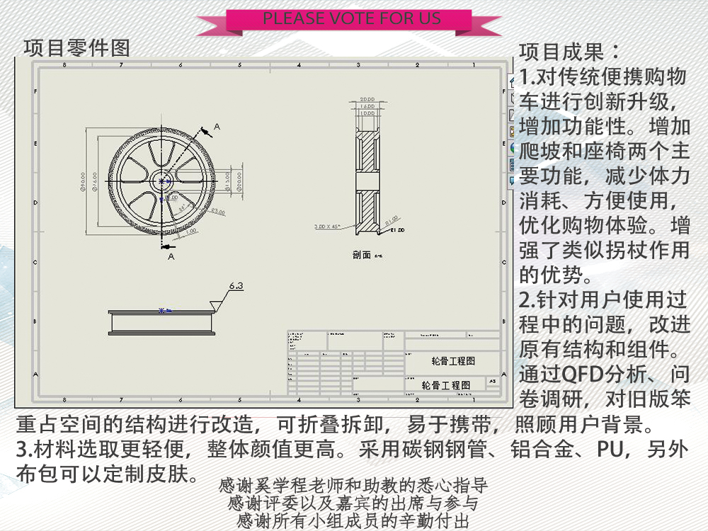 1. 对传统便携购物车进行创新升级,增加功能性。增加爬坡和座椅两个主要功能,减少体力消耗、方便使用,优化购物体验。增强了类似拐杖作用的优势。