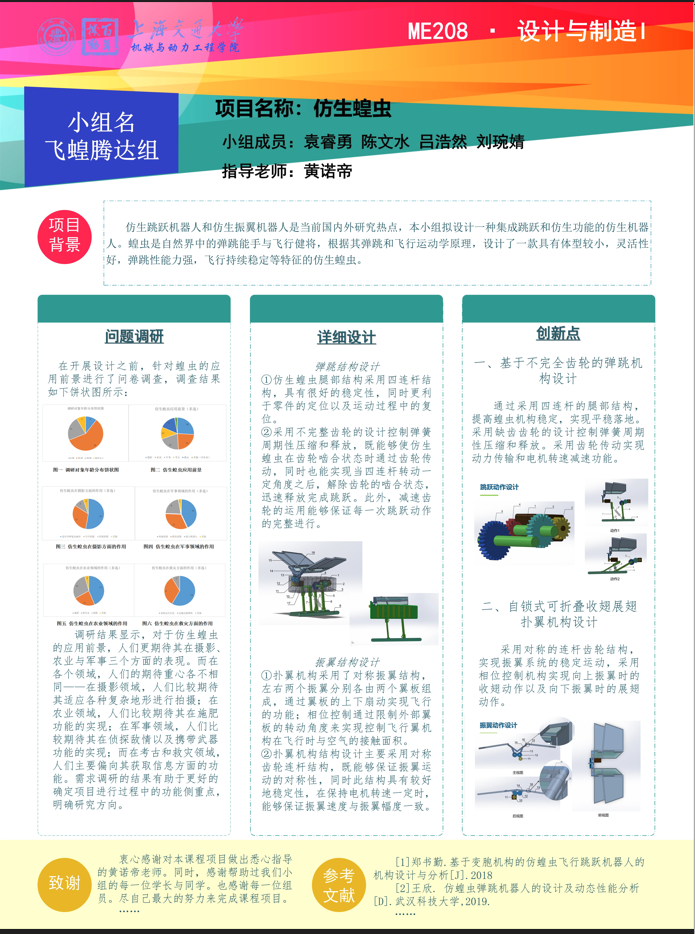 当前,国内外关于仿生跳跃机器人和仿生振翼机器人的研究颇丰,于是,本小组萌生了设计一种将二者功能相结合的仿生机械,而蝗虫,正好是自然界中的弹跳能手与飞行健将,于是我们希望设计一款仿生蝗虫,实现其体型较小,灵活性好,弹跳性能力强,飞行持续稳定的功能。我们不仅希望能够给这两种类型的机器人研究提供新思路,同时也认为仿生蝗虫能借助其优势应用于各个领域,如摄影,军事,地质勘探等领域。