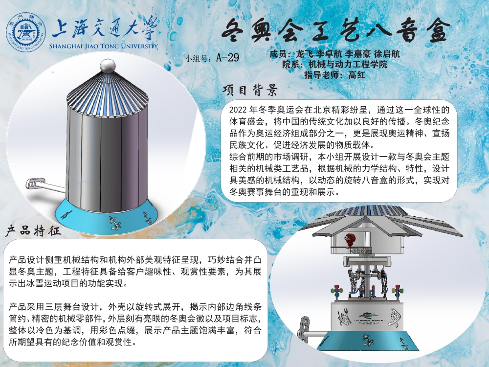 2022年冬季奥运会在北京精彩纷呈,通过这一全球性的体育盛会,将中国的传统文化加以良好的传播。冬奥纪念品作为奥运经济组成部分之一,更是展现奥运精神、宣扬民族文化、促进经济发展的物质载体。综合前期的市场调研,本小组开展设计一款与冬奥会主题相关的机械类工艺品,根据机械的力学结构、特性,设计具美感的机械结构,以动态的旋转八音盒的形式,实现对冬奥赛事舞台的重现和展示。
