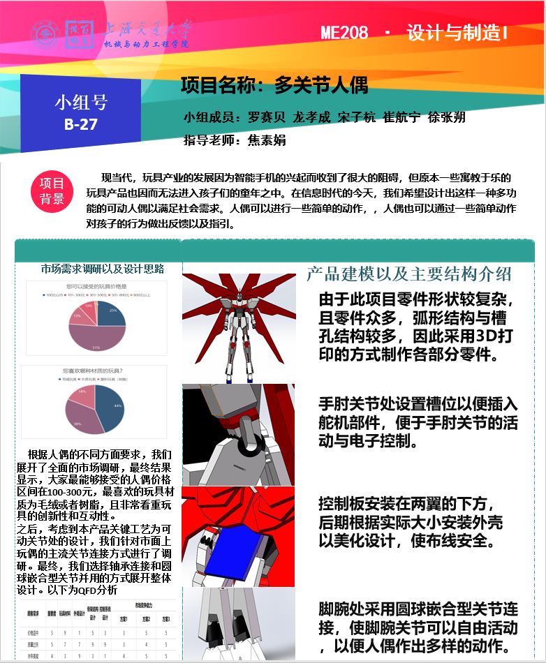 本项目基于多关节人偶,希望打造出一种能够寓教于乐的玩具,丰富人们的生活,经过最终的讨论,我们决定将其设计成高达模型的外形,并对其关节处进行精妙设计,使其能够根据需求做出不同的动作。在实现的过程中,小组成员积极讨论,修改模型,优化设计,才完成了最后的成品。相比与其他多关节人偶以及高达模型,本产品具有更复杂的自由度与电控装置,可以更加智能方便的控制人偶,也可以满足人们对于人偶动作更多元的需要。