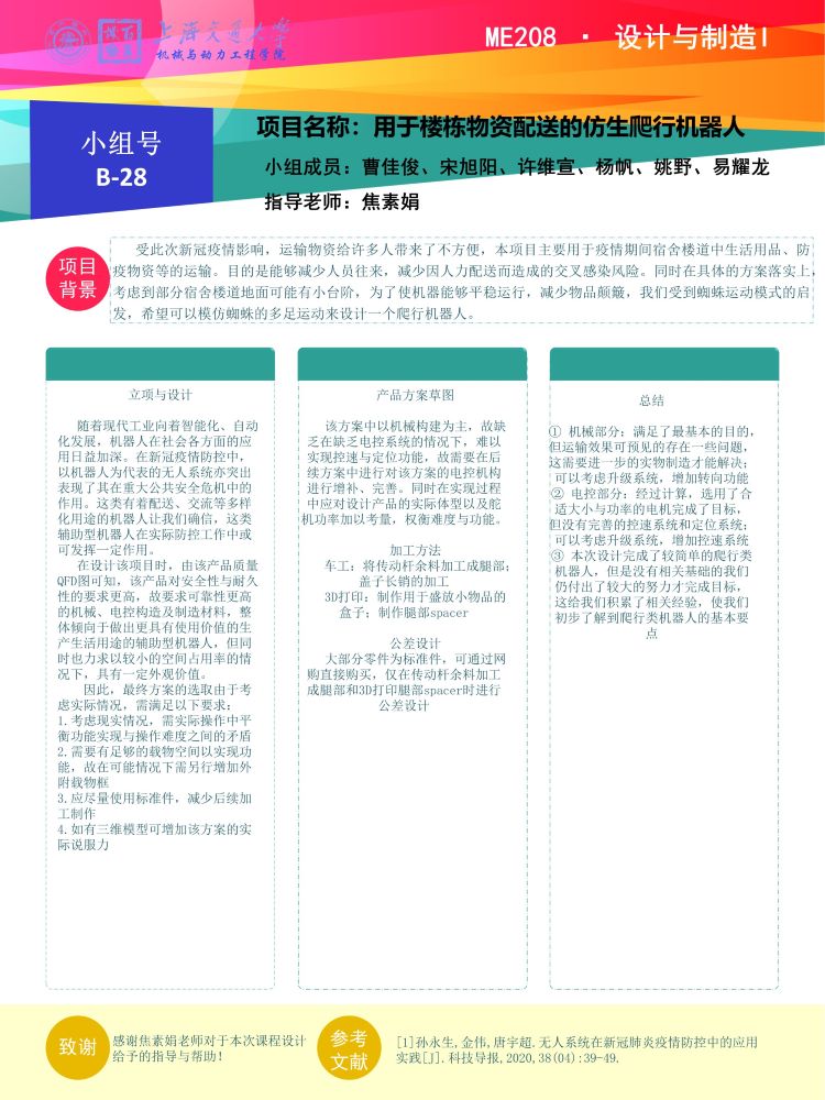 随着现代工业向着智能化、自动化发展,机器人在社会各方面的应用日益加深。除市场需求外,在新冠疫情防控中,以机器人为代表的无人系统亦突出表现了其在重大公共安全危机中的作用。本项目主要用于疫情期间宿舍楼道中生活用品、防疫物资等的运输。目的是能够减少人员往来,减少因人力配送而造成的交叉感染风险。考虑到部分宿舍楼道地面可能有小台阶,为了使机器能够平稳运行,减少物品颠簸,我们受到蜘蛛运动模式的启发,希望可以模仿蜘蛛的多足运动来设计一个爬行机器人。