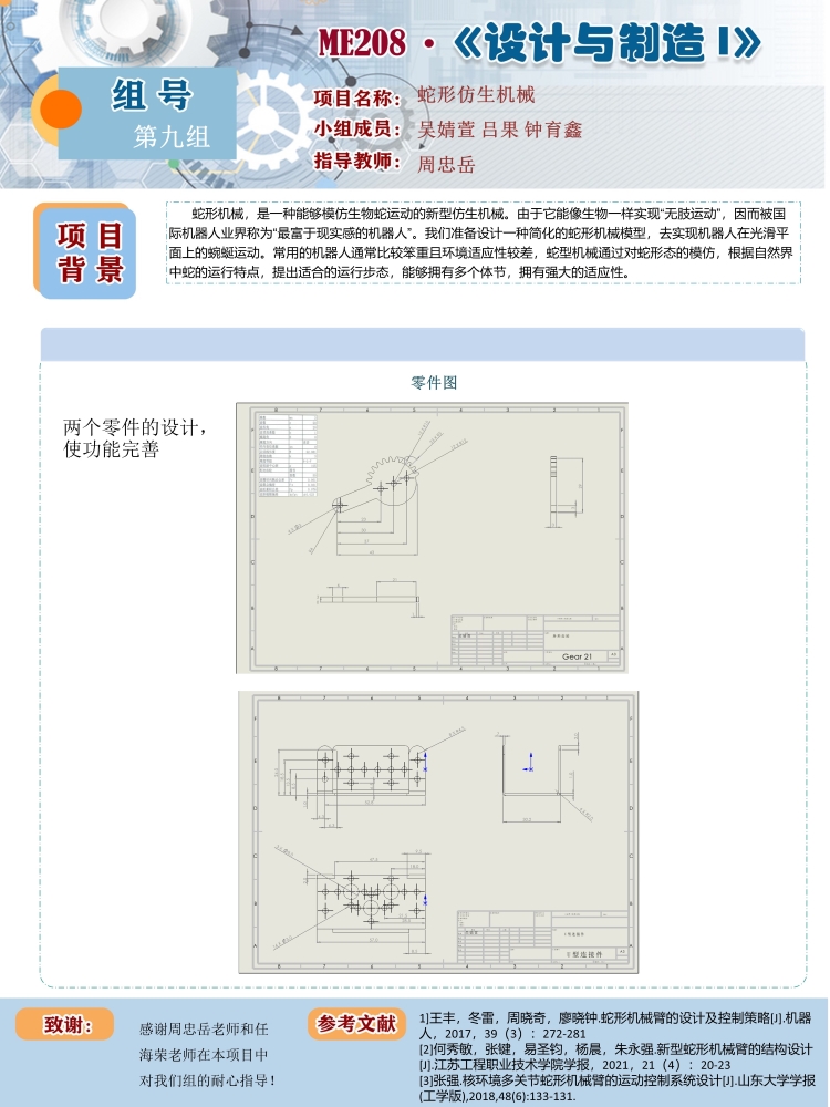 我们组的项目是蛇形仿生机械。机械整体为多节小型机械组成整体蛇形机械,两个轮子用以前后运动;机械之间以可转动轮轴连接,用以控制整体机械的转动及位置高度变化引起的攀爬等动作。小节机械通过电线连接至主控板。装有摄像头及红外装置以便更好地探测。在每个单向轮与机身各部位之间插入悬停装置减少其滚动的不稳定性。设计的重点主要放在细长形状和便于控制两项易于实现且需求较高的特性上,其余的或多或少由于技术不到位暂时无法实现。由于技术原因我们没有使用电源,但是可以作为后续考虑问题。