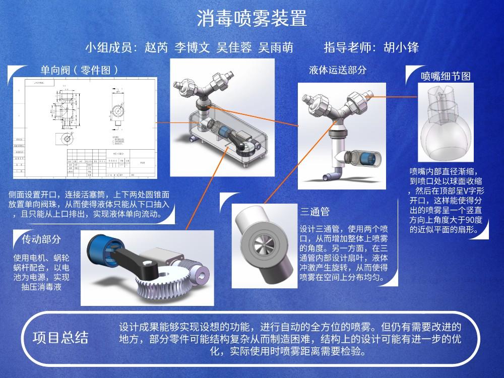 设计适用教室、食堂、走廊等室内场所的消毒装置。首先使其能够完成喷洒消毒液的工作,同时要求喷雾空间分布均匀广泛,需要注意喷嘴和输送结构的设计。然后是使用电动代替人工,要求进行传动设计。其次,要求使用操作需要简单,兼顾便携性,因而结构设计不宜太复杂。另外,一些消毒液有一定腐蚀性,以此对材料也有一定要求。
