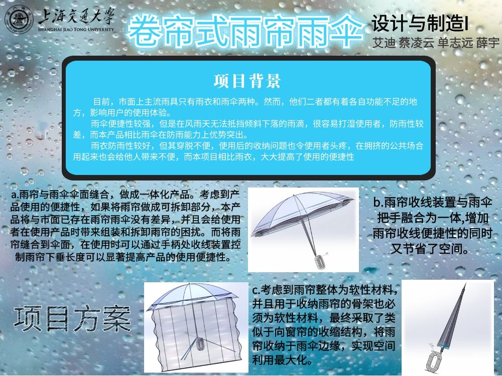 1、实现卷帘式雨帘雨伞的主要功能:在雨伞上加装能够防雨的雨帘;