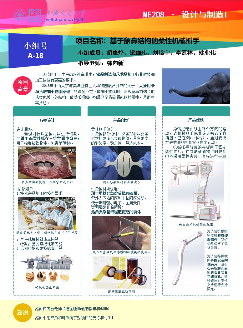 现代化工厂生产流水线车间中机械臂具有非常广泛的应用,在食品制造和艺术品加工行业中对精细加工往往有更高的要求。小组成员从大象鼻部拾取物体的原理中汲取灵感,设计了一款基于象鼻结构的柔性机械抓手,通过纸张裁剪技术和多自由度机械臂装置实现对粘软、细小等不易抓取物体的稳定控制,并通过排列、组合、放大等方式实现不同尺寸、不同规则物体或多个物体的抓取。