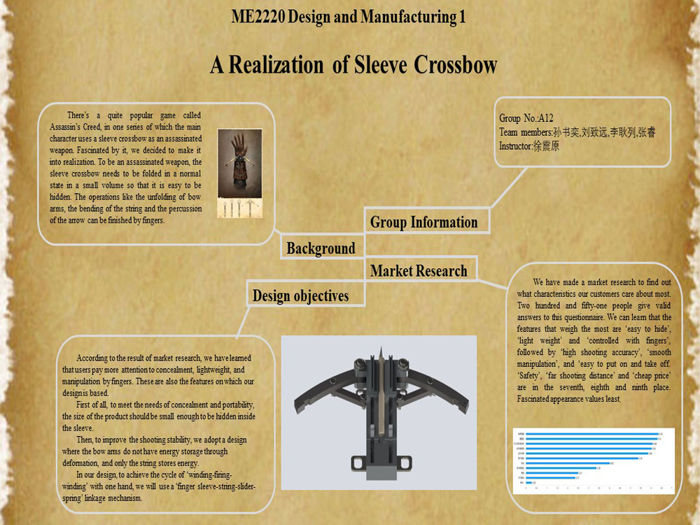 本项目是以电子游戏《刺客信条:大革命》(Assassin’s Creed Unity)中的虚构武器—幻刃(Phantom Blade)为灵感来源,自主设计的一种能够实现单手操作的易隐蔽远程发射式弓弩类武器模型。《刺客信条》系列中设计精巧复杂的各种装备是吸引众多玩家的一大特色,作为系列的忠实粉丝,我们希望尝试以模型的形式,在现实世界复现“幻刃”这一虚构的武器。考虑到现在的市场上并没有仿制较好的“幻刃”模型玩具,而《刺客信条》系列粉丝数量众多,购买潜力大,本项目也具有较好的市场前景。