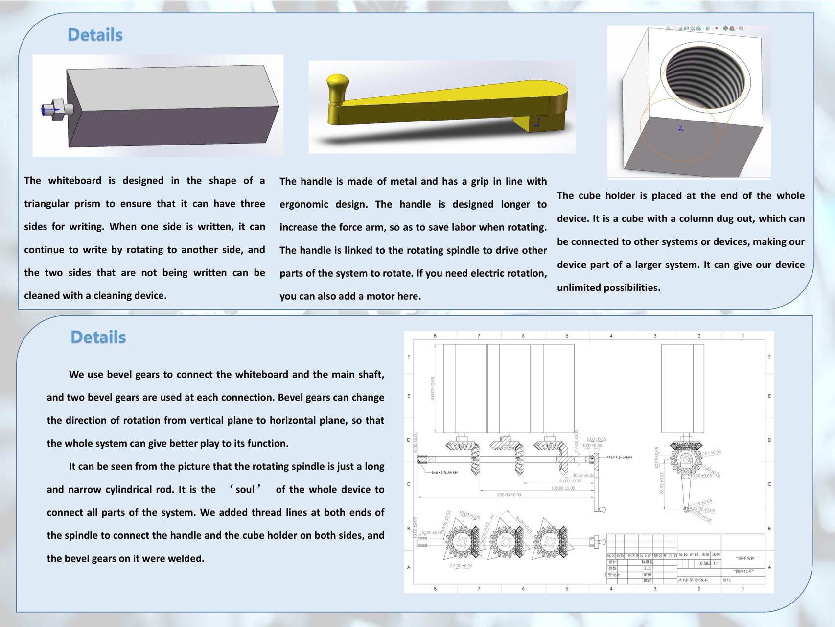 The epidemic of COVID-19 makes it impossible for us to build a prototype. The final result of our project is a 3D solidworks model. The 3D solidworks model is made up of four main parts: rotation shaft, gears, handle and white board (rotating unit). The 3D model is able to simulate the main function of our design. When we twist the handle of the model in solidworks, the white board rotates as well. Gears are the key to the driving structure. Every rotating unit is connected to a gear, and the rotation shaft is connected to gears as well. The movement of three pairs of “umbrella gear” help to transit the movement of the handle. However, there still exist something to be optimized, such as the ratchet and the cleaning structure. The application of ratchet helps to held the rotation unit in place, so that the white board will not rotate when the teacher is writing. The cleaning structure is supposed to be passive. Passive structure will cause zero carbon emission and cause much lower noise than electric motor. In our schedule drawing, we show the element of “self-cleaning white board” in detail, include measurement, screw thread, manufacturing tolerance, and so on.
