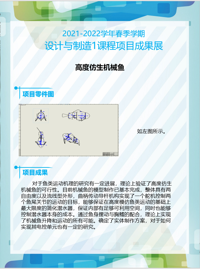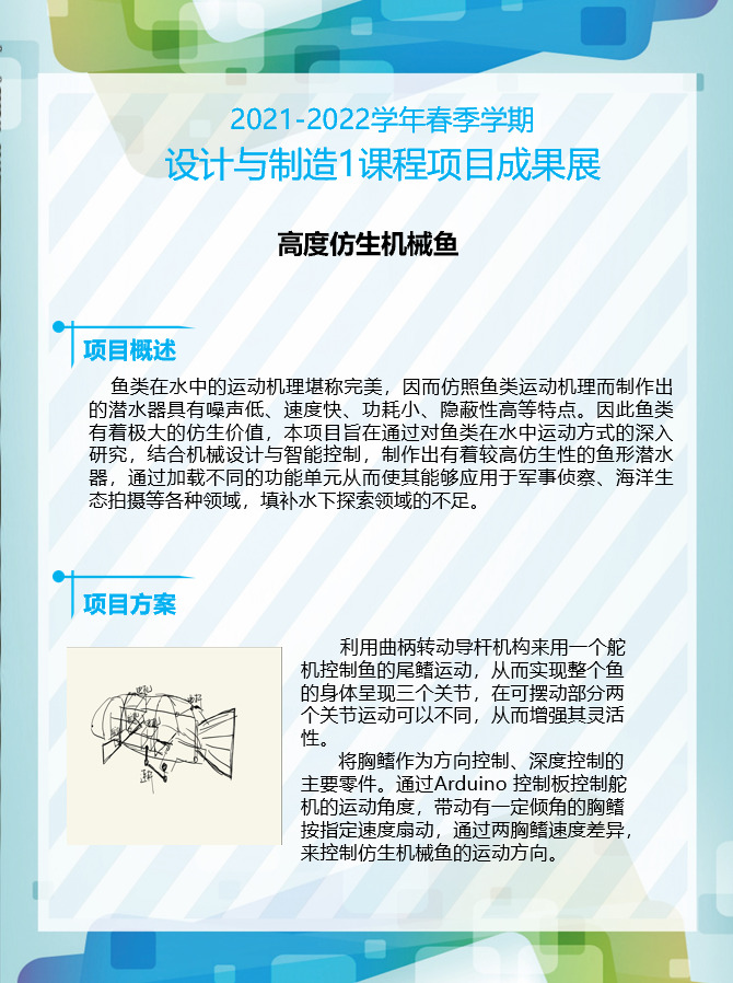 鱼类在水中的运动机理堪称完美,因而仿照鱼类运动机理而制作出的潜水器具有噪声低、速度快、功耗小、隐蔽性高等特点。因此鱼类有着极大的仿生价值,本项目旨在通过对鱼类在水中运动方式的深入研究,结合机械设计与智能控制,制作出有着较高仿生性的鱼形潜水器,通过加载不同的功能单元从而使其能够应用于军事侦察、海洋生态拍摄等各种领域,填补水下探索领域的不足。