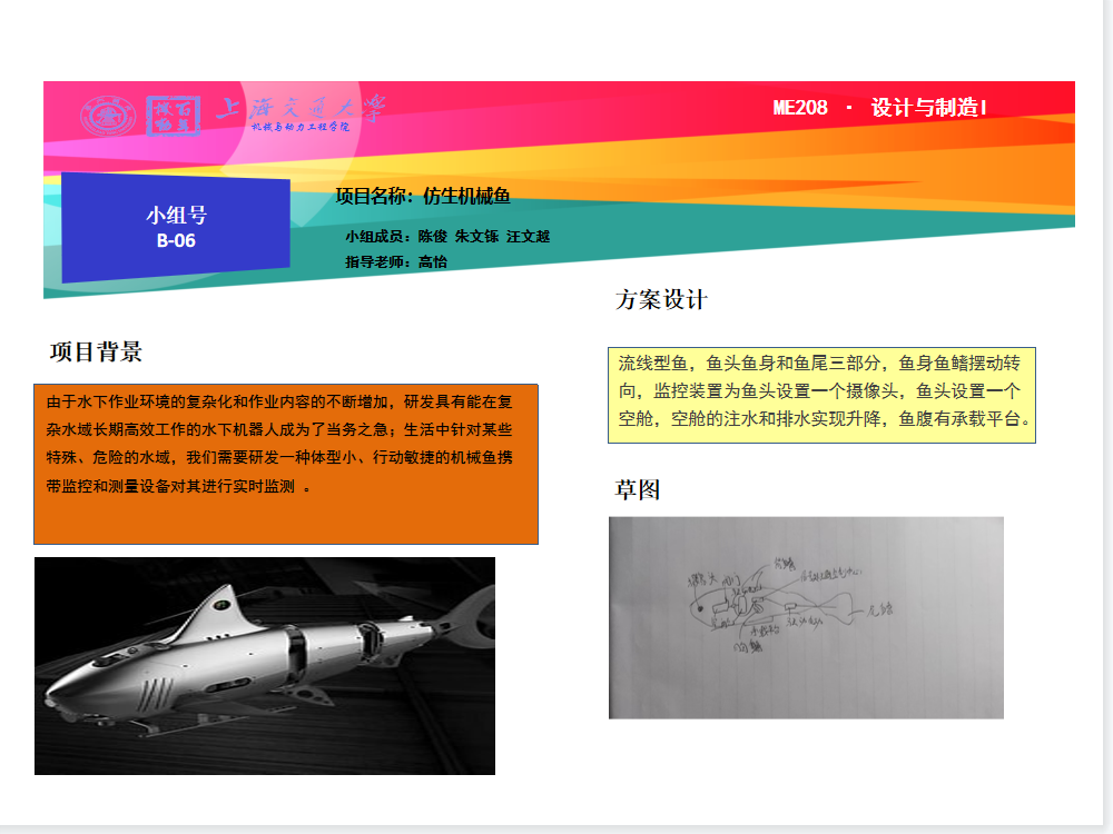 随着社会的发展,人们对水下的世界进行了进一步的探索,在水下开展了许多新的项目和工作,水下作业环境的复杂化和作业内容不断增加,因此,研发具有能在复杂水域长期高效工作的水下机器人成为了当务之急;生活中针对某些特殊、危险的水域,我们需要研发一种体型小、行动敏捷的水下机器携带监控和测量设备对其进行实时监测,经过市场调研和对机器结构的探究,我们发现,鱼有灵活、推进效率高、适应性强的优点,于是我们最终选择了机械鱼作为监控和测量设备的载体。