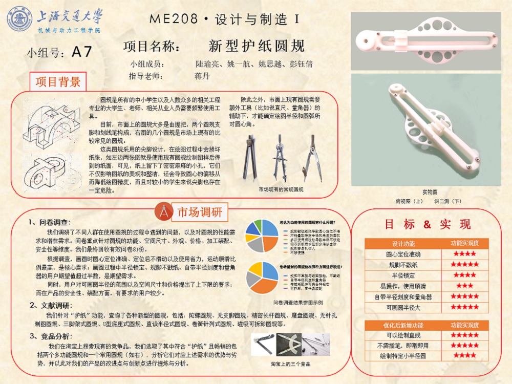 本项目通过市场调研挖掘出不同人群在圆规使用过程中的问题,以及对圆规的性能需求和潜在需求,并根据有需求的人数比例来确定每个的设计目标的权重,从而得出产品设计的主要目标。产品必须达成的目标有圆心定位准确、使用方便省力、自带半径刻度和量角器、半径锁定、规脚不戳纸,期望目标有可画圆的范围大、更换铅芯方便、可微调、便于携带、安全。对应工程指标为使用力度1N, 锁紧力度5N,空间尺寸180*50*30mm,测量精度1mm,可画圆半径上限150mm, 圆心滑移上限0.5mm