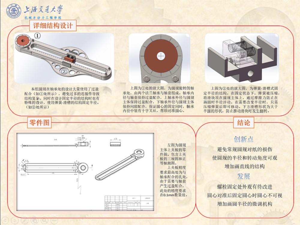 圆规是所有的中小学生以及人数众多的相关工程专业大学生、老师、相关从业人员需要频繁使用工具。但是目前,市面上的圆规大多采用尖脚设计,在绘图过程中会损坏纸张,不仅影响图纸的美观和整洁,还会导致圆心的偏移从而降低绘图精度,而且对较小的学生造成潜在危险。除此之外,市面上现有圆规需要额外工具的辅助下,才能确定绘图半径和圆弧所对圆心角。所以, 本项目旨在设计一种新型圆规,主要针对圆规画圆半径角度直读和防止圆规对纸张的损害两个问题进行探索。