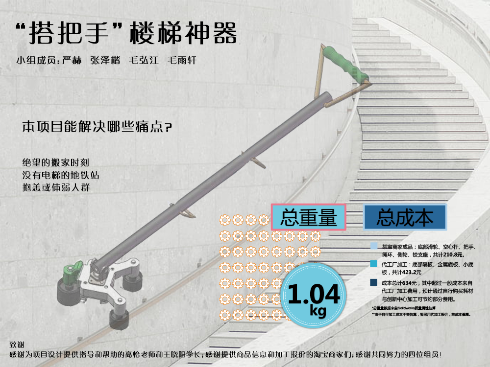 日常生活中,人们往往会遇到人工搬运重物上下楼梯的情形,如搬家、旅行以及搬运米面油等日常必需品。而大部分情况下人们的解决方式是纯人工搬运。事实上,纯人工搬运方式既费力又不舒适,基于以上问题,本项目组设计了一款利用杠杆原理的用于上下楼梯搬运重物时的新型辅助机械装置。该产品将解决全年龄段市民,尤其是老人和女性,生活中搬运物品上下楼梯、外出旅行搬运行李箱的问题,会是一款真正便利广大市民生活的实用工具。