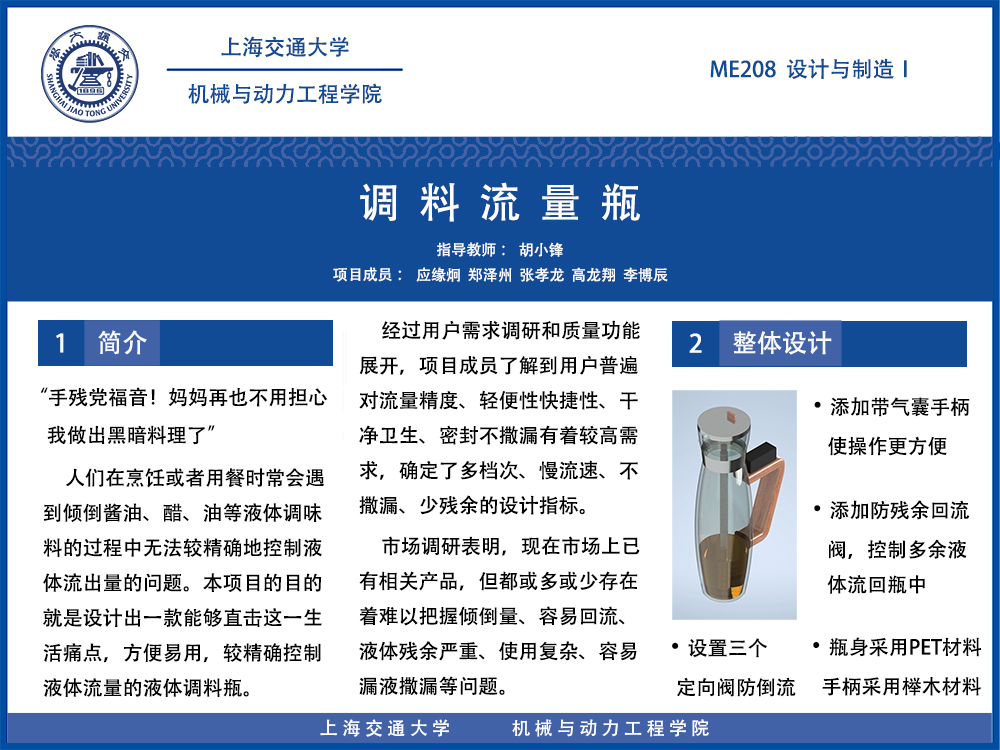 “调料流量瓶”设计项目基于人们在生活中会遇到的倾倒酱油、醋等液体调味料时无法较精确控制液体流出量的问题,设计出一款能够直击这一生活痛点,方便易用,较精确控制液体流量的液体调料瓶。本项目考虑到普遍看重流量精度、轻便性快捷性、干净卫生、密封不撒漏的顾客需求,抓住用户痛点,参考市场类似产品的设计,着重针对倾倒精度、装置密封性、液体残余、使用复杂度等方面汲取长处与经验教训而设计。