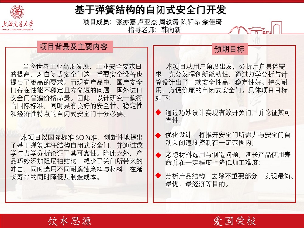 本项目从用户角度出发,分析用户具体需求,充分发挥创新能动性,通过力学分析与计算设计一款安全性高、稳定性好、持久耐用、方便价廉的自闭式安全门。具体项目目标如下:
