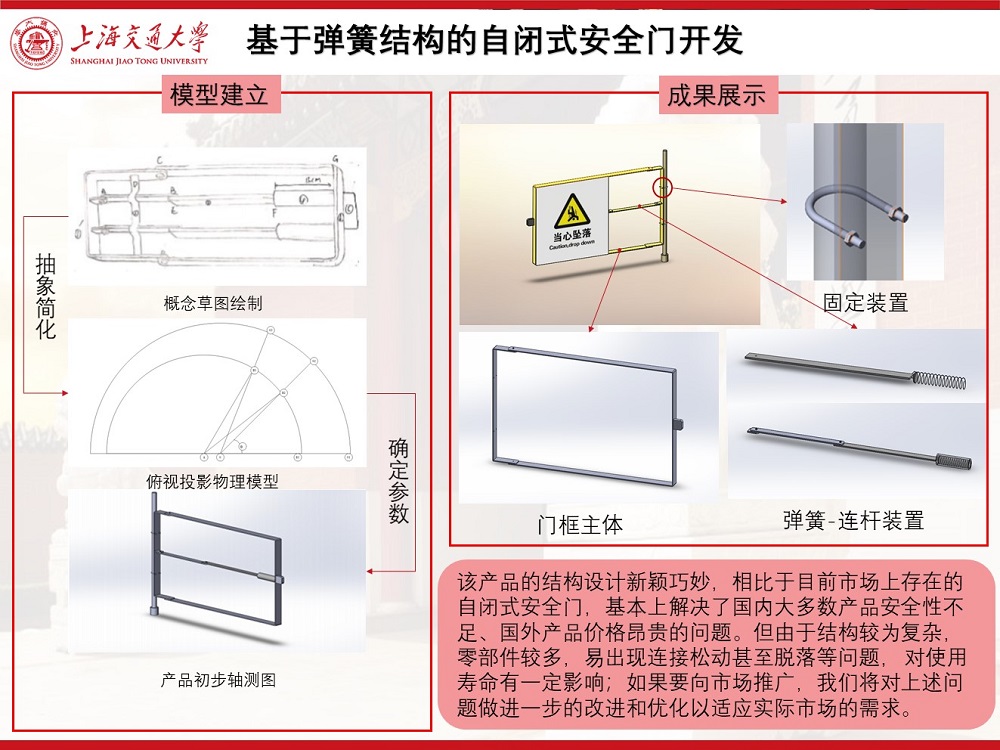 1.  设计了一款基于弹簧连杆结构的自闭式安全门,结构巧妙,并通过数学与力学分析论证了其可靠性。除此之外,为减少冲击、延长寿命,产品巧妙添加阻尼结构、选用不同耐腐蚀涂料与材料,降低其制造成本。
