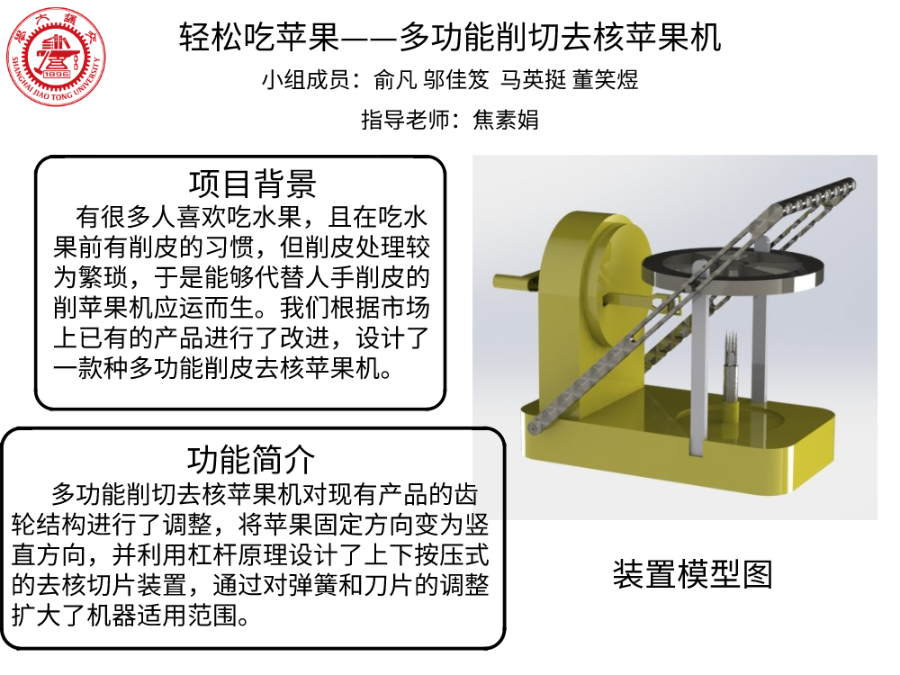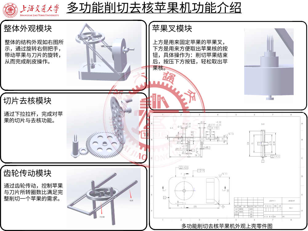 经过数次推倒重来,本小组确定了产品的各功能模块划分以及齿轮传动结构,能够将苹果竖直放置,并且在课程结束前完成了课程项目设计。通过理论计算确定了苹果机的外壳尺寸、刀片、弹簧、齿轮规格等详细参数,运用Solidworks将概念设计形成了三维模型,通过数字样机基本实现了削皮、切片、去核、取核等基本功能;但很遗憾没有做出实物样机来印证本小组的设计。