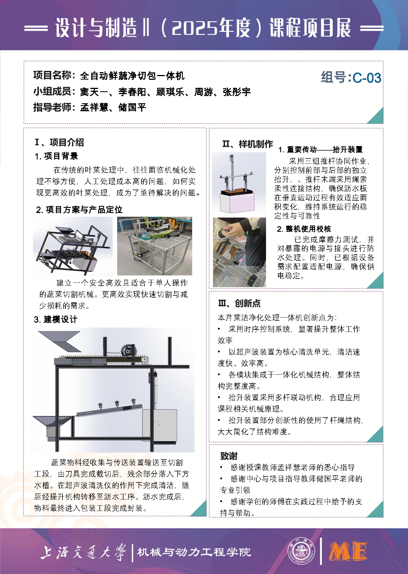本项目研发了一套基于时序控制的自动化蔬菜预处理装备。系统集成超声波清洗模块与多杆联动抬升机构,通过一体化机械设计实现了切割、清洁、沥水及包装工序的连续化作业。研究体现了机械系统集成、过程控制与工程实践的有效融合。