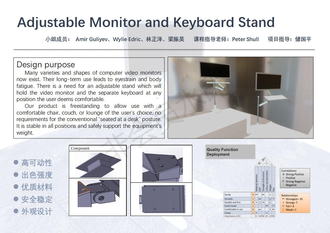 We planed to design a freestanding monitor and keyboard stand which can solve the problems and meet customers’ needs. A majority of people felt a middle or higher discomfort because of the position of their computers. Many expressed their desire to buy a product to solve their problem, with average max price at 188RMB. So basically there is a large number of potential users. We investigated various aspects they focus on, and drew a QFD diagram, which indicated the degree of freedom, or mobility, to be most important. It should be comfortable and friendly to use. Weight and size are also main factors, and we need to ensure strength of structure, to ensure safety. Material selection is of the same level and will influence the factors mentioned. Although appearance is the least emphasized. We will make a design to make it attractive to users.