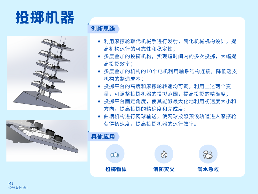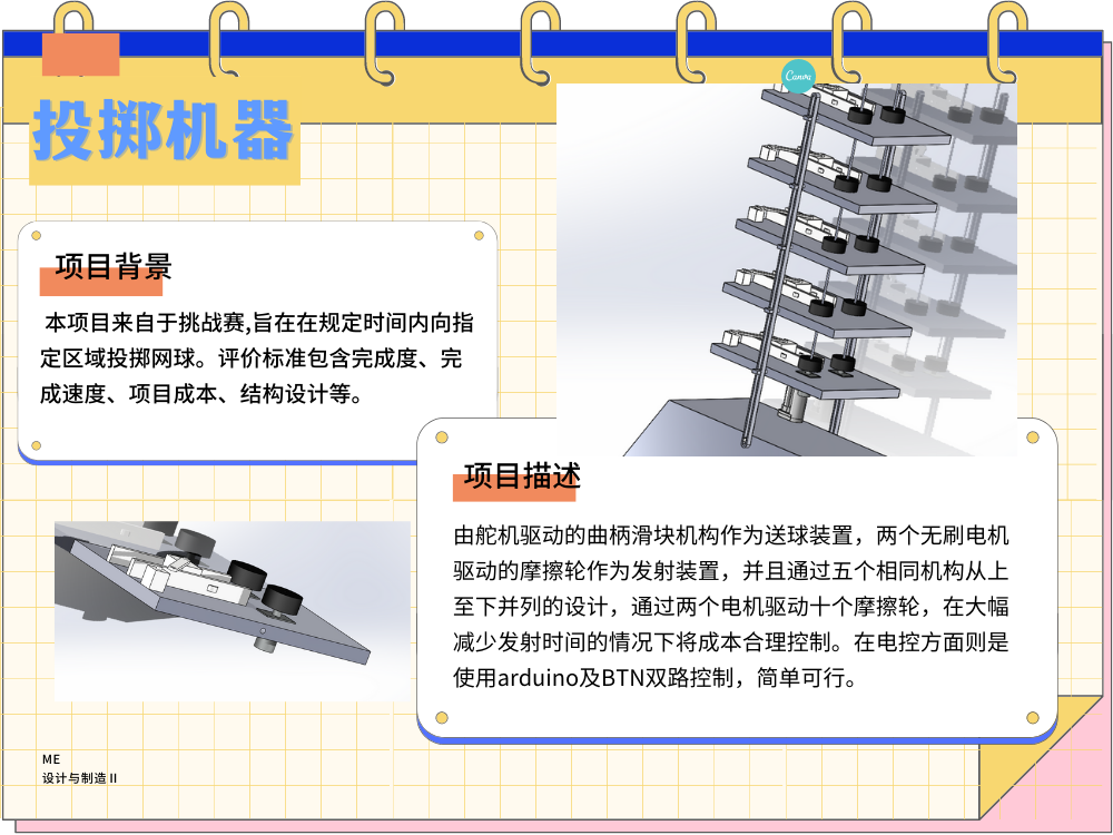 具体来说由于第一评价指标为完成度,第二评价指标为时间,并且在综合考虑其他因素过后本小组选择使用由舵机驱动的曲柄滑块机构作为送球装置,两个无刷电机驱动的摩擦轮作为发射装置,并且通过五个相同机构从上至下并列的设计,通过两个电机驱动十个摩擦轮,在大幅减少发射时间的情况下将成本合理控制。在电控方面则是使用arduino及BTN双路控制,简单可行。