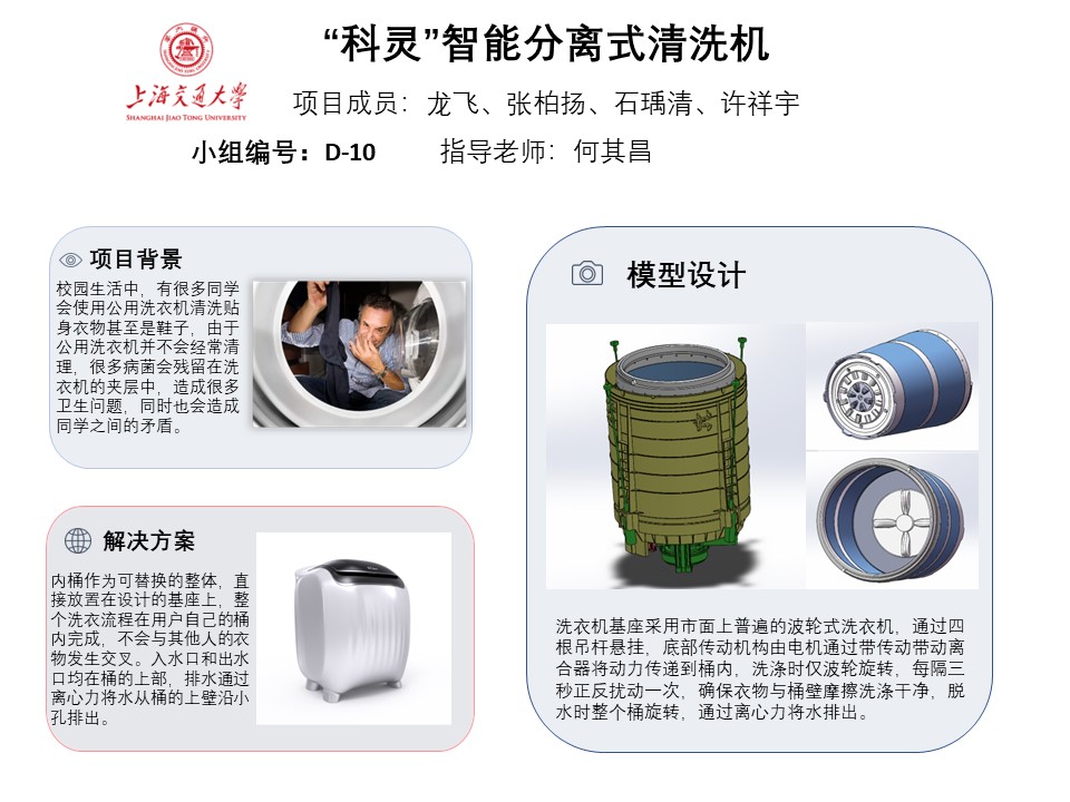 由于在日常生活中,公用洗衣机清洗贴身衣物甚至洗鞋子,而公用洗衣机又不会及时的清理,病菌的滋生会加剧衣物之间的交叉感染,在这后疫情时代会导致严重的卫生问题,甚至屡次激发用户之间的矛盾。所以我们设计了这款可分离式的针对贴身衣物的智能清洗机,用户在清洗衣物时只需将个人所属的桶放入我们提供的基座内就能完成整个洗涤程序,所有的洗涤步骤都在用户自己的桶内完成,就不存在与其他用户之间的交叉,从而解决这类卫生问题。