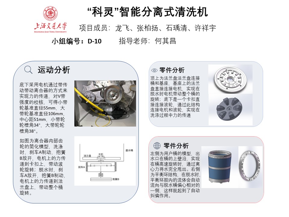 综合考虑了波轮和滚筒洗衣机之间的优劣对比,我们最终选用了波轮式结构作为我们产品的模型参考。我们通过牵引器驱动离合器的切换实现了桶内衣物洗涤和脱水两种不同模式的转速,通过优化桶的设计,将排水口设计在上壁沿巧妙实现脱水,通过设计法兰盘和卡扣等结构实现桶和基座之间的连接和电机力的传递,提供完备的洗衣流程并保证了较高的洗衣效率。初步实现了在全自动清洗的基础上完成水渍隔离的目的,避免了衣物之间的交叉。