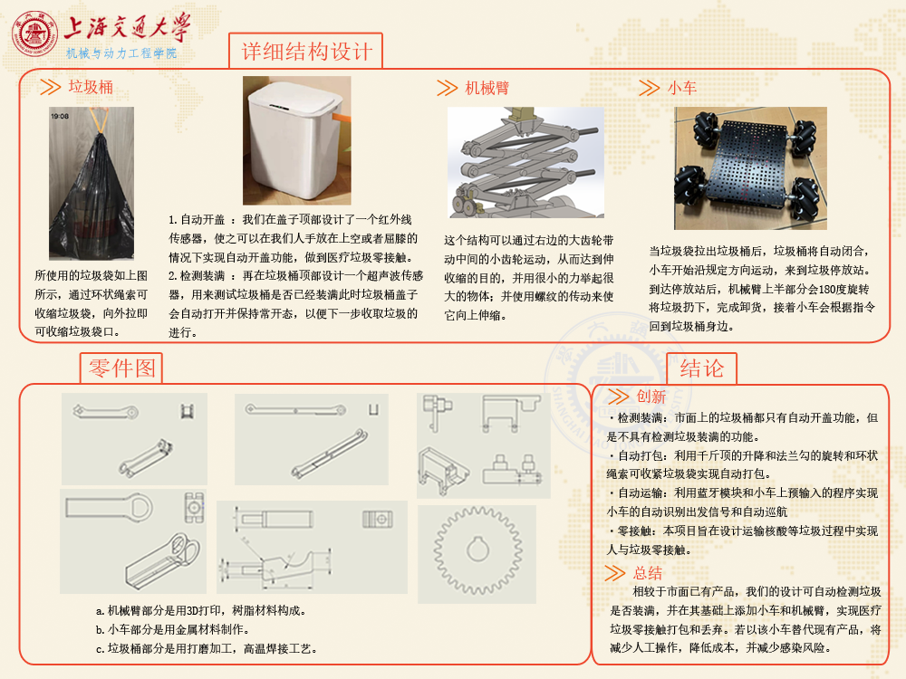 在疫情的大背景前提下,在医院甚至一些非医疗场所都可能会产生大量的医疗垃圾,医疗垃圾化学成分复杂,很有可能对人有害,并且也会含有病毒,但是垃圾桶不能自动开盖、医疗(如核酸)垃圾袋收纳的时候麻烦,所以人在进行医疗垃圾打包的过程中可能会有接触到医疗垃圾并被感染或者二次伤害的风险。本项目针对该问题拟开发能够感应人手或脚的自动开盖垃圾桶,同时想要做到垃圾袋打包的功能,还有自动倒垃圾的装置。