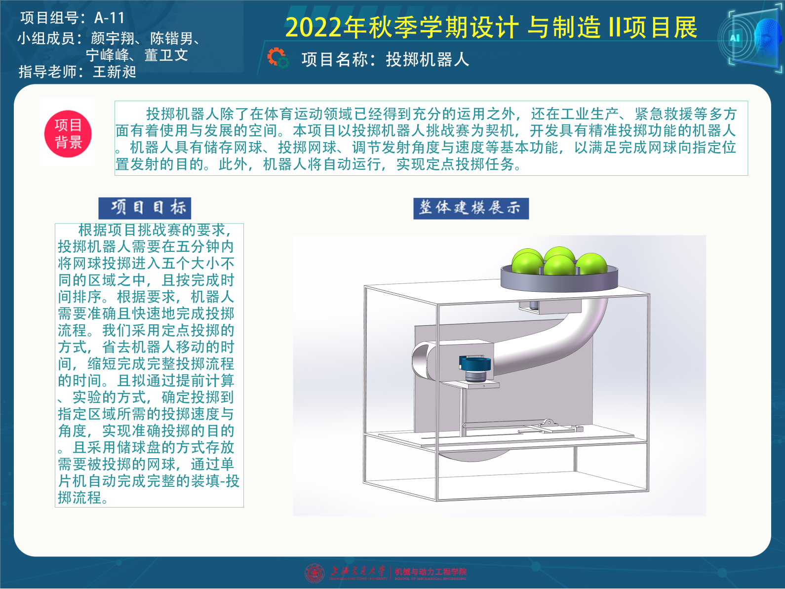 投掷机器人除了在体育运动领域已经得到充分的运用之外,还在工业生产、紧急救援等多方面有着使用与发展的空间。本项目以投掷机器人挑战赛为契机,开发具有精准投掷功能的机器人。机器人具有储存网球、投掷网球、调节发射角度与速度等基本功能,以满足完成网球向指定位置发射的目的。此外,机器人将自动运行,实现定点投掷任务。
